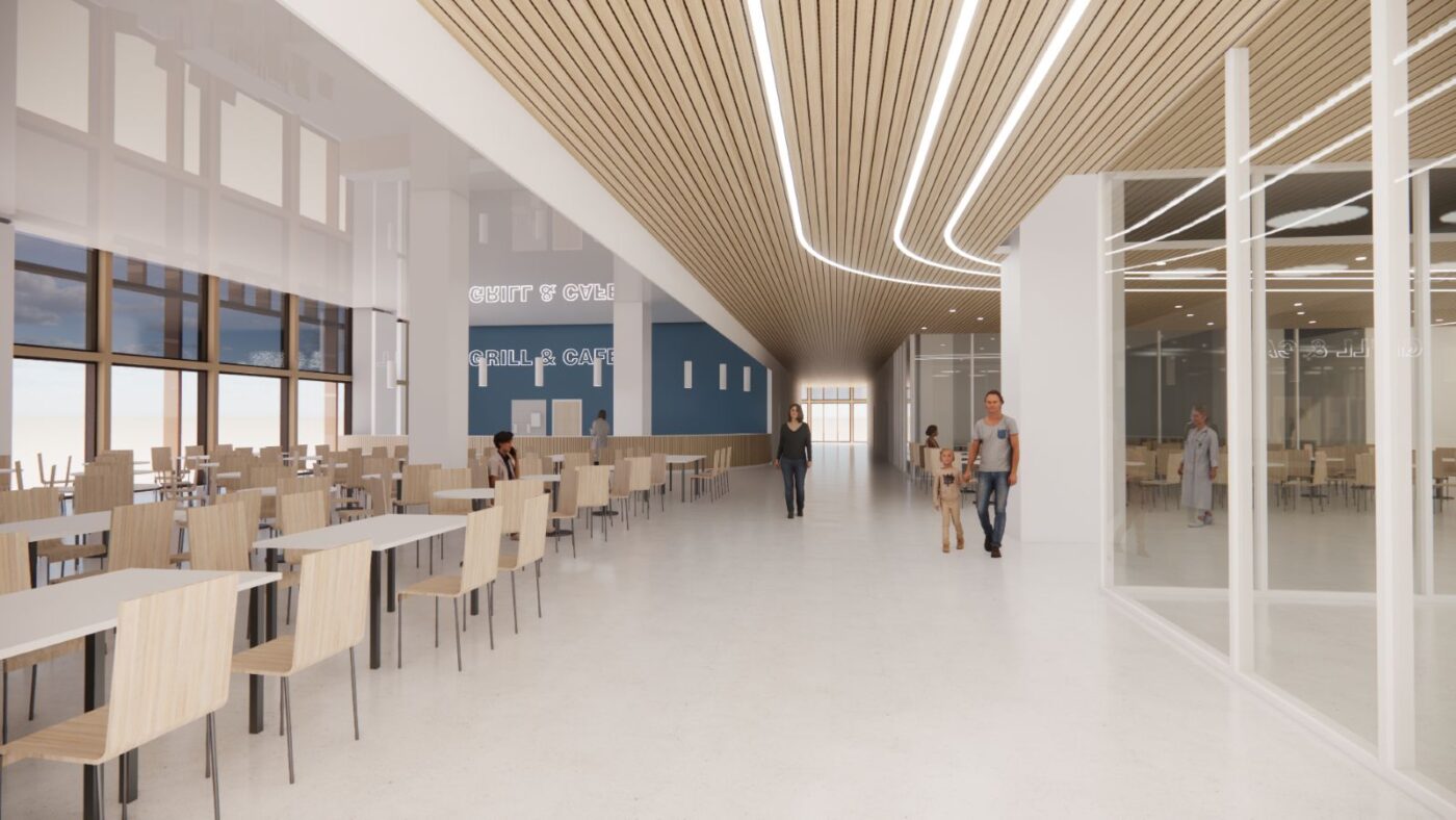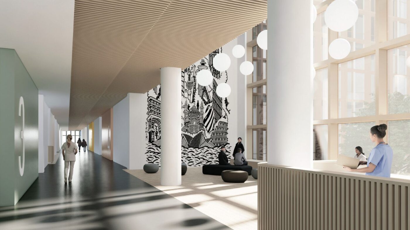 Rakennuksesta on kiinteät yhteydet nykyisiin sairaalarakennuksiin sekä uuteen pysäköinti- ja huoltorakennukseen.